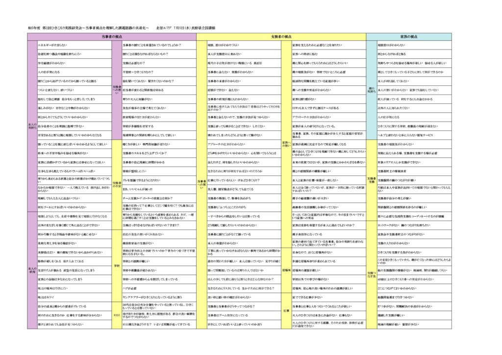 昨年の実践研究会を受け、今年度も「当事者の思いにより深く気づく、想像してみる」「受け止める側の困り感を他者と共有する」ことをテーマに掲げ取り組んでいきます。第1クールでは、誰が、何に、どうして困っているのかをそれぞれの立場・視点に立って考えるワークを行いました。以下、会場ごとのまとめになります。